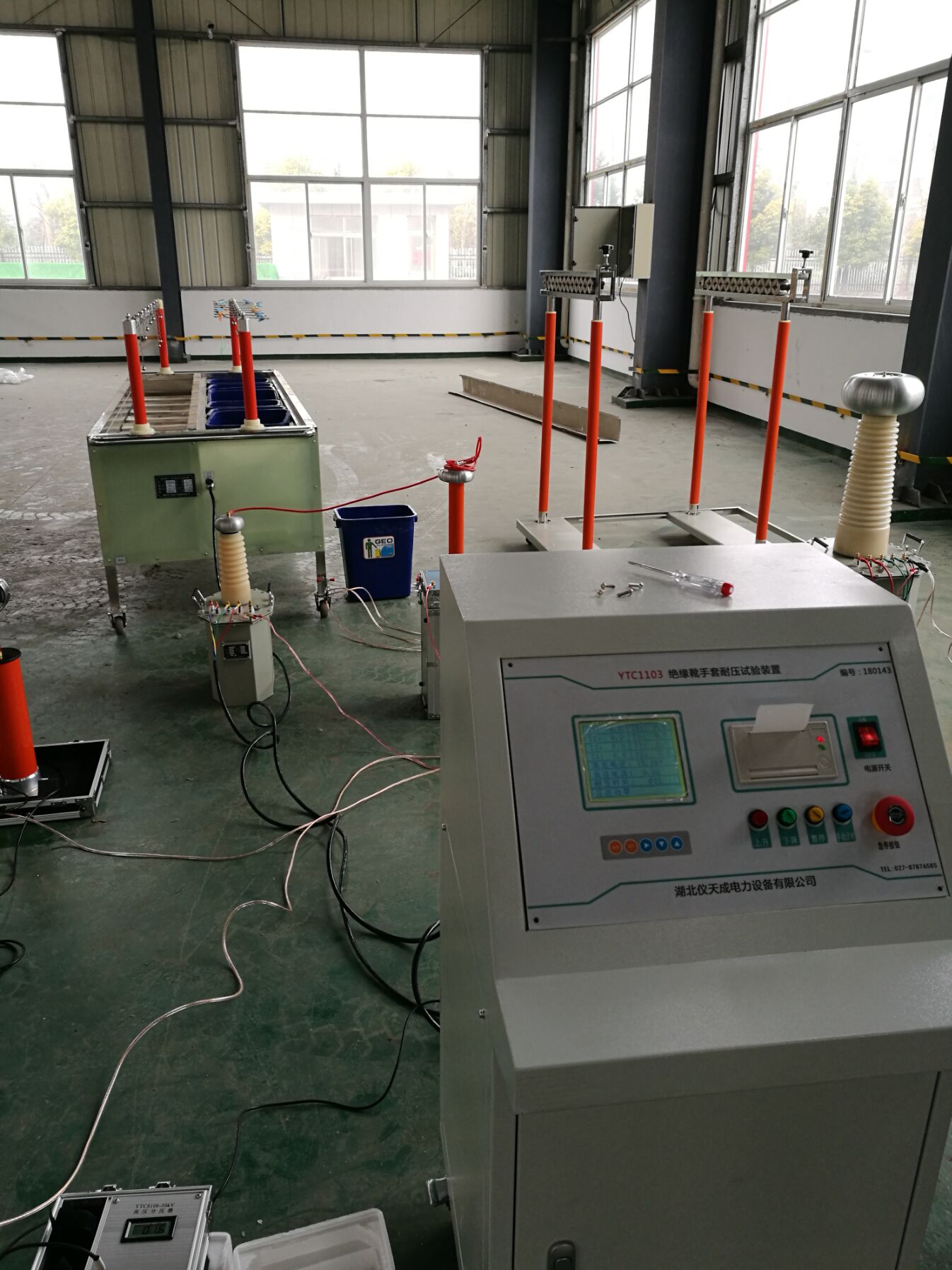 此次培訓的主要設備是我公司的產品:YTC1103絕緣靴手套耐壓試驗裝置,該試驗裝置是絕緣靴(手套)批量試驗的專用設備。也可以對安全工器具進行測試,是我公司根據絕緣靴(手套)的試驗要求,并遵從廣大用戶意見而設計生產的。該產品有效的解決了過去不規范試驗,提高了工作效率、保障了工作安全,是理想的絕緣靴(手套)專用設備。該產品采用先進的微電子處理技術,全部使用過程可提前進行設置,全中文界面,操作簡單明了。全部測試項目設定后自動進行測試,無須人工干預。