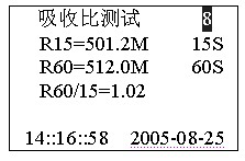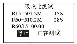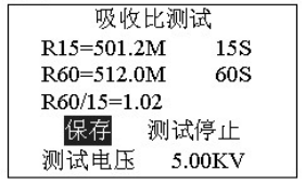 正在測試,若想停止測試,按確認(rèn)鍵停止測試。吸收比測試完畢后自動計(jì)算比值,進(jìn)入是否保存提示。